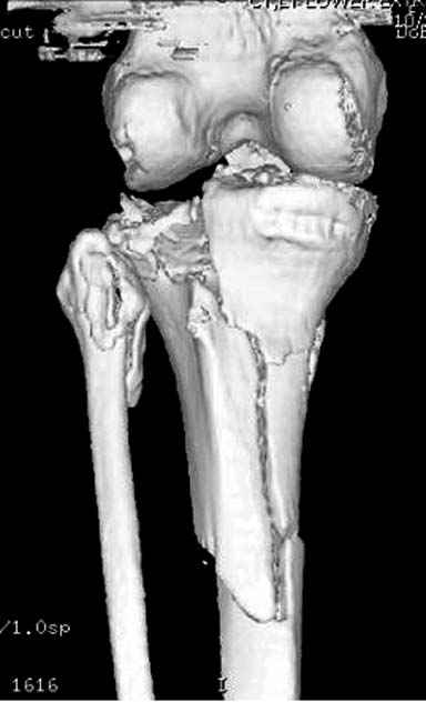 Отдельные переломы тибиал плато и перелом проксимальной трети большеберцовой кости отличаются от переломов тибиал плато с вовлечением диафиза. Здесь перелом тибиал плато типа Schatzker VI, полученный в результате высокоэнергетической травмы. Перелом метафиза образовал отрыв суставной поверхности от диафиза с вовлечением медиального и латерального мыщелков. Двухмыщелковые переломы из-за укрочения опасны развитием компартаментального синдрома, повреждением латерального мениска и связок.