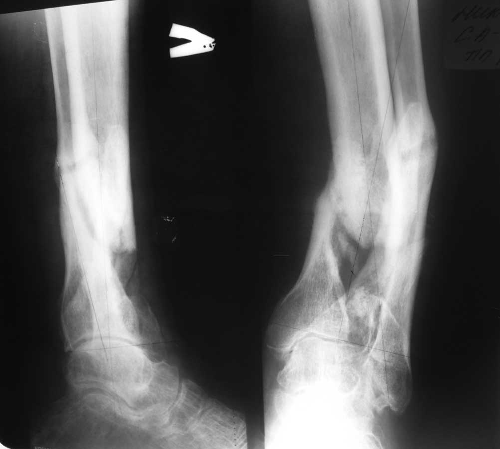 Интересный случай. Допускаю, что состояние мягких тканей приемлемое. Цель лечения должна заключаться, как мне кажется, в ликвидации ложного сустава и достижении артродеза голеностопного сустава. Впрочем, это две взаимосвязанные задачи. Мы бы оперировали следующим образом. Остеотомия малоберцовой кости на вершине деформации. Передне-медиальным доступом артротомия голеностопного сустава, резекция суставных поверхностей с отломков большеберцовой и таранной костей, удаление рубцов между отломками дистального эпиметафиза большеберцовой кости, антеградный стержень с дистальным блокированием в таранной кости, костная пластика дефекта спонгиозным костным трансплантатом из крыла (возможно сразу из двух) подвздошной кости. Банальные артродезы голеностопного сустава мы обычно выполняем антеградным блокированным стержнем (см. вложенный файл),