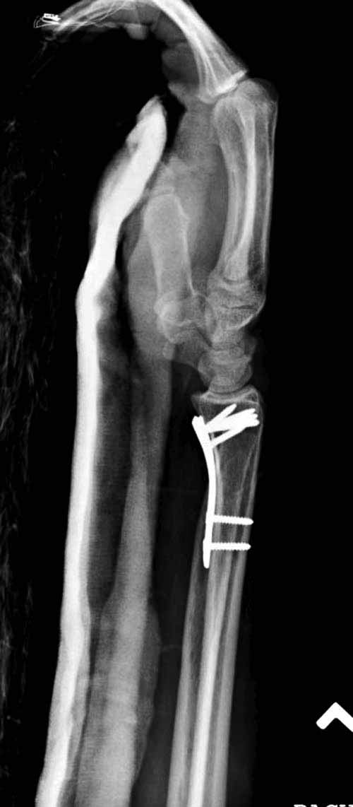 Согласен с последним предложением относительно применения аппарата внешней фиксации. Повреждения луча по типу "переднего Бартона" очень хорошо закрыто устраняеются в АВФ, при этом завершающим элементом (после достижения репозиции посредством постепенной дистракции) может быть введение спицы с упором (конечно, вне проекции срединного нерва и сухожилий сгибателей пальцев)и обеспечение боковой компрессии переднего отломка к основному фрагменту.