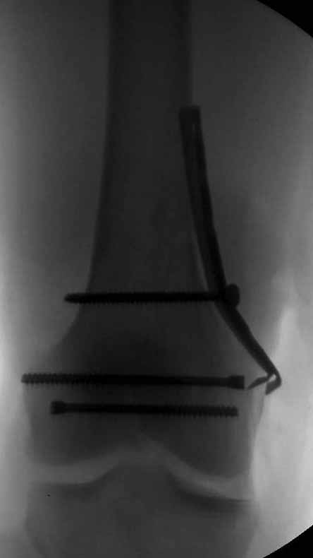 У больных как в этом случае, с вовлечением двух мыщелков правильно, что сделали вытяжение до операции. Здесь имеется флексионный компонент на другой стороне, и я бы рекомендовал операцию делать из двух доступов. Сперва фиксировать медиальную колонну custom made пластиной, обычно 1/3 тубулярной пластиной в 4.5 мм, потому что пока производители опаздывают с медиальной пластиной.