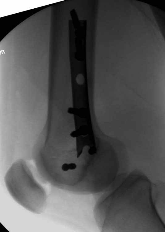 Однако в случае, представленном Константином Никитиным, не может быть применён ни ретроградный ни антеградный остеосинтез. Причина - нереально выполнить вышеуказанные необходимые требования, касающиеся дистальных блокирующих винтов. Из-за низкого перелома латерального мыщелка (перелом Hoffa) невозможно через него провести хотя бы 2 блокирующих винта, поскольку линия перелома мыщелка расположена либо на уровне верхушки межмыщелковой ямки либо незначительно проксимальнее. Поэтому авторам, с моей точки зрения, необходимо прислушаться к рекомендациям Джолдаса.