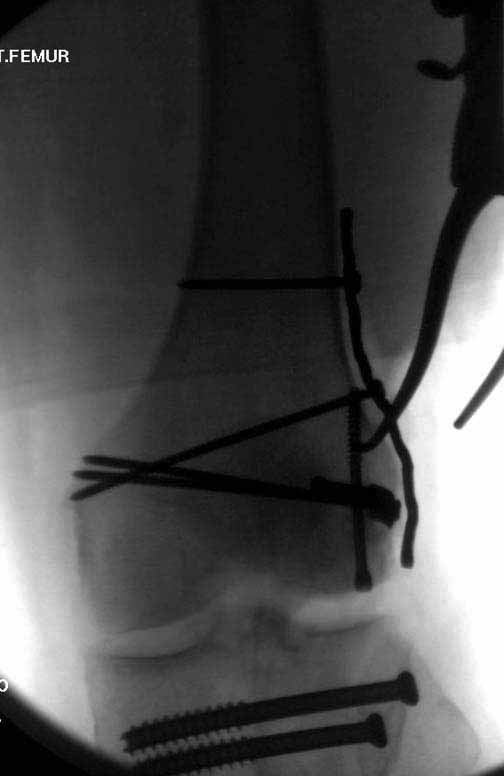 В приложении пример недавней операции, C3, открытая репозиция, фиксация мыщелков спицами и винтами, ретроградный синтез большеберцовым гвоздем 10,5 мм диаметром, винты 5 мм.