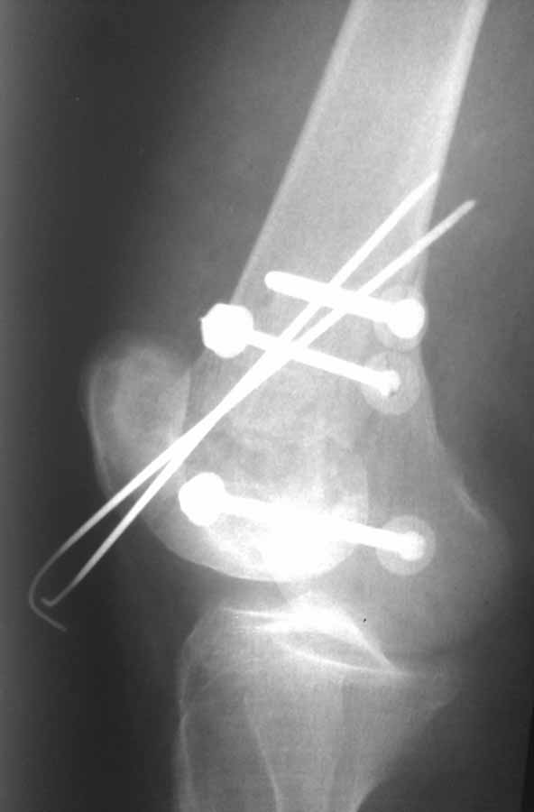 Выбор имплантов не совсем удачный, подкожно выступающие болты в мыщелках вскоре могут привести к проблемам. Вместо солитарной фиксации болтом-стяжкой дистально можно было бы добавить пару винтов, которые создали бы ротационную стабильность и межфрагментарную компрессию.