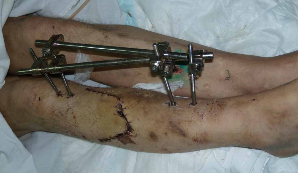 При поступлении оперирован : трепанация, ПХО, остеосинтез голени.