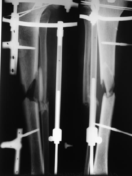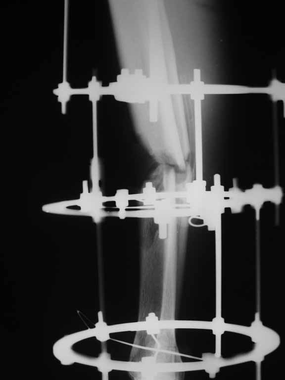 А тем “энтузиастам”, которые желают продолжить лечение в аппарате, можно рекомендовать технику замещения дефекта участком кортекса. Описание метода можно встретить во всех руководствах Илизарова. Метод хороший, но для достижения сращения необходимо больше времени, и всегда имеется риск вторичного осложнения через прошитые мышц спицами.