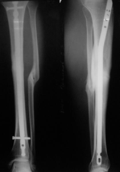При переломах с небольшими краевыми дефектами в большинстве случаев проблему можно решить без особых усилии. Проблема наступает тогда, когда выбирается неадекватный метод фиксации, например применение наружных фиксаторов, где острый “карандаш” костных отломков не создает условия для сращения.