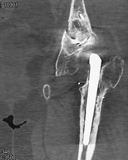 Стрессовый перелом лонной кости и нестабильный эндопротез с противоположной стороны. |