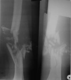 Выбранная сегодня, как я понял, тактика лечения раненого ХХХ – ПХО + внешняя фиксации + промывные системы закончится, на мой взгляд, длительной госпитализацией, плохими функциональными результатами (прежде всего функции колена), необходимостью повторной хирургии, потерей большого массива костной ткани, длительной реабилитацией.
