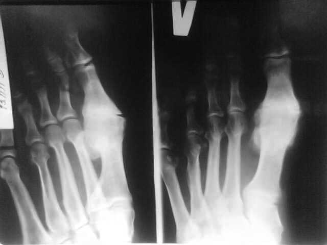 Это типичный Hallux rigidus в достаточно запущенной стадии: деформации костей, массивные костные разрастания, выраженное ограничение функции. Возможные варианты лечения - артродез или артропластика 1 ПФС.