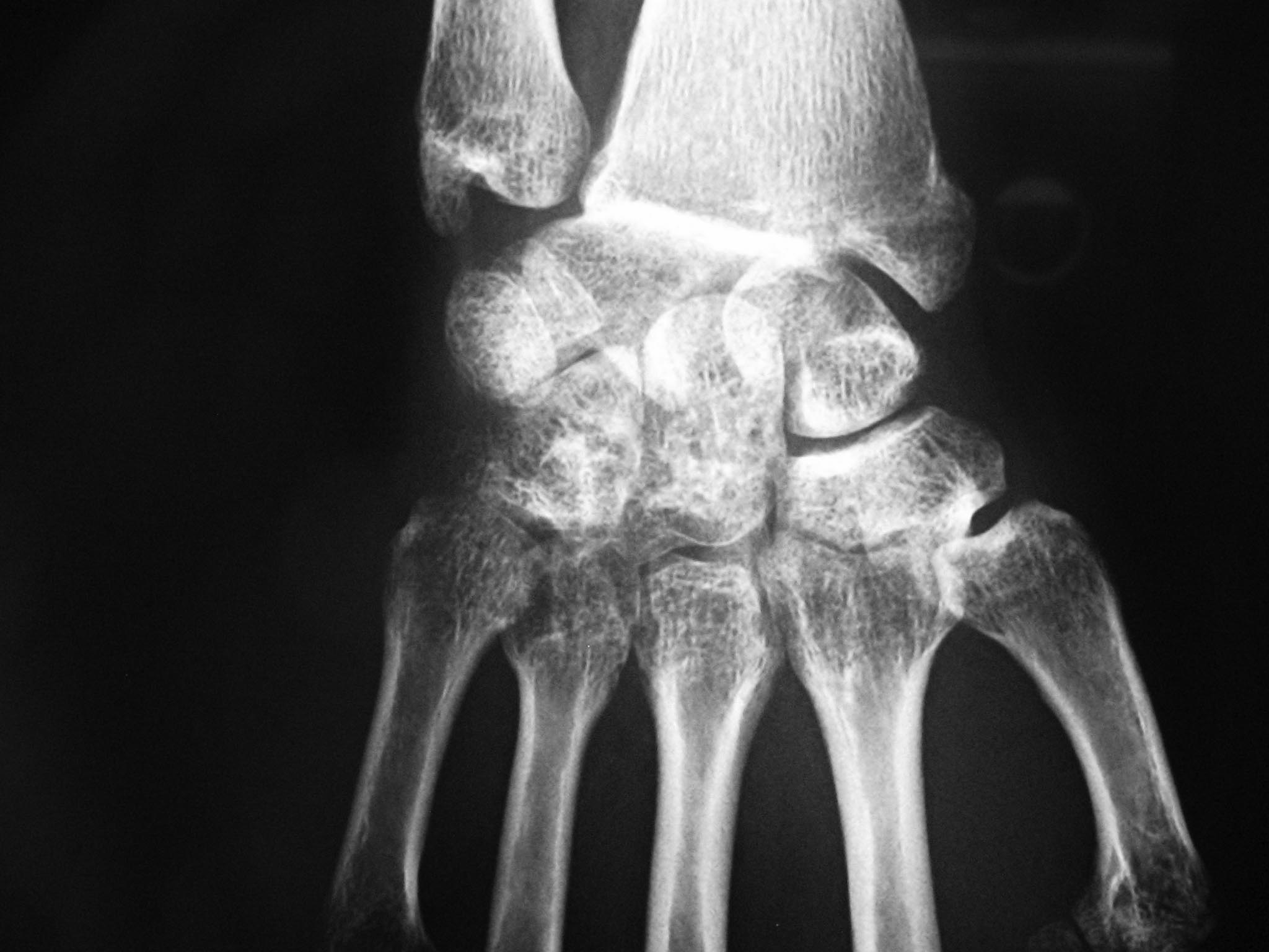 травма месячной давности, на сегодняшний день мы имеем неправильно сросшийся перелом шиловидного отростка лучевой кости, вывих полулунной кости и альгодистрофию лучезапястного сустава. < | >