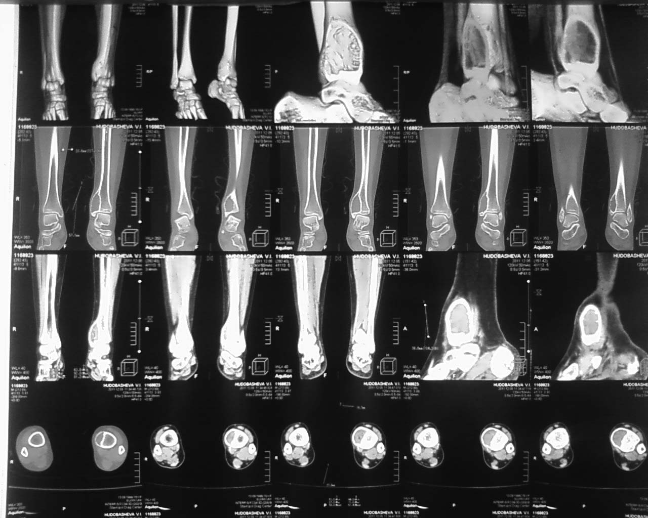 Здравствуйте уважаемые коллегиПомоги определится с тактикой лечения больного ребенка 15 лет. Жалобы на наличие опухолевидного образования в нижней трети левой голени. Болеет с апреля 2011 г., обратились к врачу по м/ж в ноябре 2011, после проведения рентгенографии и КТ направлена к нам с диагнозом: остеобластокластома дистального метафиза левой б/берцовой кости.Локально: определяется умеренная болезненность при пальпации н/3 голени. Планируется выполнить биопсию.