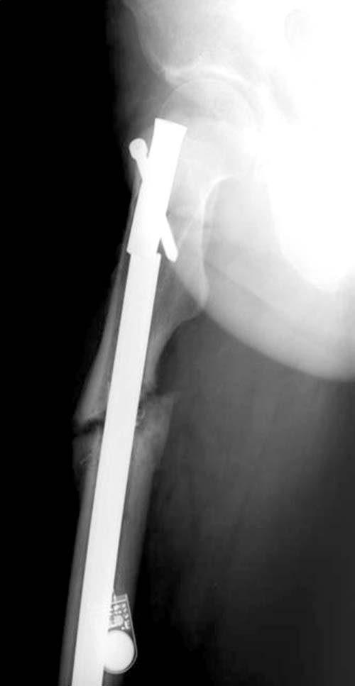 Надо удалить стержень, восстановить длину бедра (одномоментно или постепенно), и вновь синтезировать стержнем. На этот раз правильно расположив его в проксимальном отломке.
