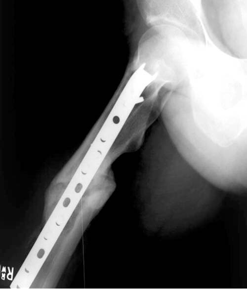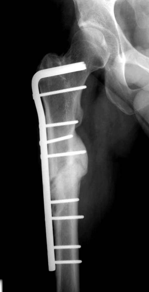 напрашивается естественно исправление оси бедра, ну и штифтование более толстой конструкцией с рассверливанием (своего рода тоже пластика. Думаю штифт подойдет обычный диафизарный, главное винты потолще, и дать человеку опору на ногу.