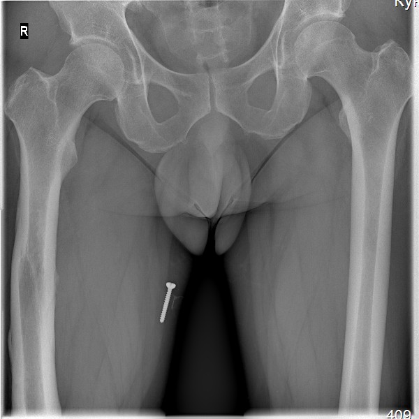 винт, видимый на рентгенснимках, фиксирован к коже пациента лейкопластырем при рентгенографии рентгенлабарантом, используется для калибровки рентегнснимка при планировании операции эндопротезирования.
