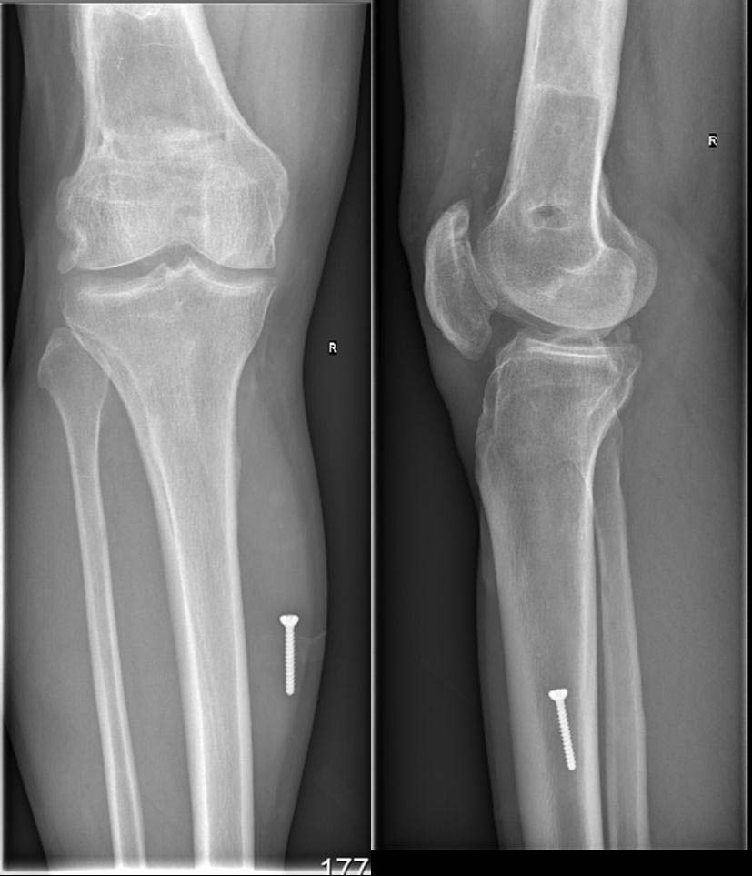 Сегодня объем движений: сгибание 60 градусов, разгибание 180. Конечно, движения в коленом суставе пока болезненны, особенно в области резецированного дистального полюса надколенника. Будем следить за реабилитацией данного пациента.