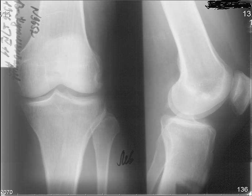 У вашего больного синдром Patella Baja или Patella Infera, т.е. низкое расположение надколенника. Состояние встречается в результате травмы или послеоперационных осложнении, например после коррегирующих операции. Сравнительные снимки показывает, что правый надколенник почти касается большеберцовую и укорочение связки приводит к нарушению пателло феморального взаймотношения. В результате такого нарушения начинается хондромаляция хрящевого покрова.