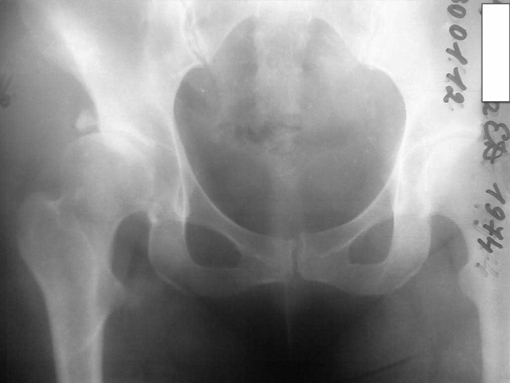 Здесь явная дисплазия с стрессовым переломом латерального края вертлужной впадины. Генез стрессовых переломов за счет нагрузки головкой в латеральный край, где сперва образуется зона разрежения, затем образование кисты в толще кости. Продолжающиеся нагрузки приводят