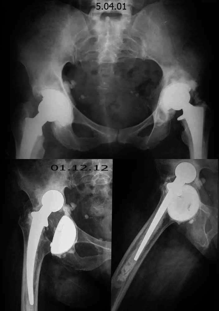 Уважаемые коллеги, помогите определиться с тактикой лечения! Больная Л. 56 лет, 20 лет страдает ревматоидным полиартритом. В 1987 году выполнена операция- артропластика левого тазобедренного сустава по Кулишу. В 1997 году оперирована - тотальное эндопротезирование правого тазобедренного сустава. В 1998 году оперирована - тотальное эндопротезирование левого тазобедренного сустава. 1,5 года назад больная упала, после чего стала отмечать боль в области правого тазобедренного сустава. Локально: правая нижняя конечность укорочена на 1-1,5см. по сравнению с левой. Движения в правом тазобедренном суставе: сгибание - 35-40º, разгибание-10º, отведение- 15º, приведение-10º, наружная ротация-20-25º, внутренняя ротация-0º. Движения в левом тазобедренном суставе: сгибание - 75-80º, разгибание-15º, отведение- 30º, приведение-20º, наружная ротация-25-30º, внутренняя ротация-20º.