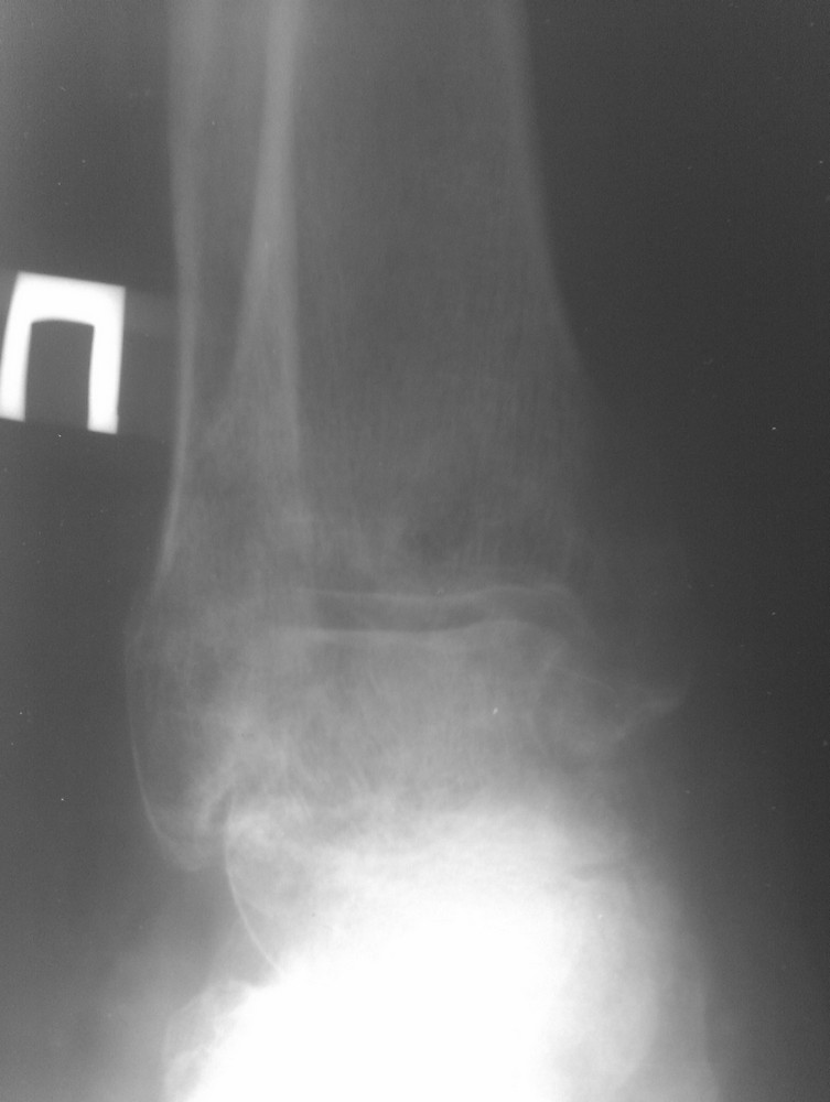 Травма от июля 2011 года, лечили консервативно гипсовым тутором (про травму лодыжек - не помнит или не знает). Через 2 недели после травмы - легочная эмболия и илеофеморальный тромбоз, находился на стац лечении. После теоретического сращения мыщелков и снятия гипсового тутора разработка движений безрезультативна, опорности конечности нет. Со слов - прыгает на костылях до самого настоящего момента.