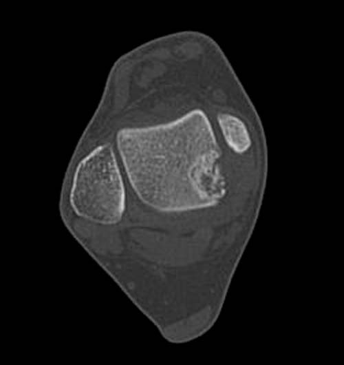 Доброго времени суток, уважаемые коллеги. Прошу помочь определиться с тактикой лечения. Пациентка 40 лет, в течение последних 8-9 мес. беспокоила боль в левом голеностопном суставе после значительной физической нагрузки (по роду деятельности вынуждена проходить в день не менее 15 км). Факт травмы отрицает. Лечилась самостоятельно, мазями и приемом НПВП. В последнее время боль стала возникать после умеренной нагрузки, присоединились отек и хромота. Прием НПВП и ограничение нагрузки до уровня бытовой болевой и отечный синдром купируют. Обратилась к нам, выявлены изменения таранной и пяточной кости, представленные на КТ. Вопрос: единственным ли выходом является артродез или можно обойтись менее радикальным вмешательством? Смущает невыраженная клиника и молодой возраст пациентки... Будем рады любой помощи со стороны уважаемого сообщества. А. Баженов, г. Екатеринбург
