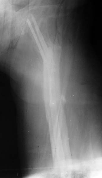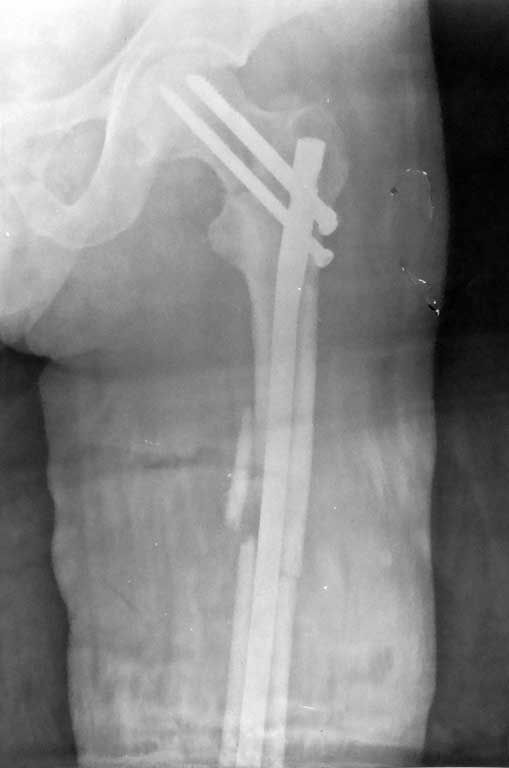 На первичных снимках был показан типичный пример осложнения, когда для фиксации ипсилатеральных переломов (шейки и диафиза) выбраны не отдельные фиксаторы, а один неадекватный гвоздь. По нашим данным, применение реконструкционных гвоздей первого поколения для фиксации ипсилатеральных переломов приводило к ложному суставу одного из компонентов, и это цифра доходила до 57%.