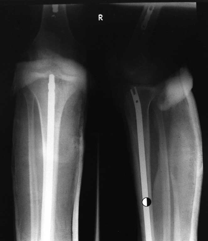 1.Удаление всех металлоконструкций (для удаления проксимальной части штифта необходимо выполнить продольную или Г-образную продольно ориентированную "ограниченную" (5-6 см) остеотомию в области истмуса, после чего штифт удаляется без проблем, но необходимо начать с полупоперечной остеотомии, с целью ограничения возможных расщепов до проксимального отдела большеберцовой кости. Остеосинтез по Илизарову с остеотомией обеих костей на вершине деформации и дистракционным остеосинтезом с устранением деформации на шарнирах. Либо клиновидная резекция с последующим дистракционным остеосинтезом.