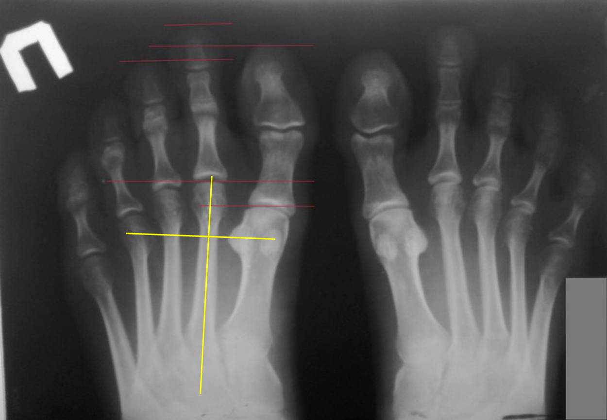 А почему Вы подумали, что 1 плюсневые укорочены? На представленной Вами рентгенограмме я провел перпендикуляр к оси 2 плюсневой кости на уровне середины латеральной сесамовидной. Линия прошла точно через середину головки 4 плюсневой. Это норма. То есть, длины 4 и 5 плюсневых соответствуют длине первой. А вот длины 2 и 3 плюсневых значимо преобладают над длиной первой. В такой ситуации развитие молоткообразной деформации 2 пальца вполне естественно. Есть ли у пациентки натоптыш под головкой 2 плюсневой? Пусть даже и бессимптомный. Если есть, то лучше всего совместить укорочение основной фаланги с остеотомией 2 плюсневой по Вейль. Сама по себе эта остеотомия дает укорочение до 3-5мм. И одновременно позволяет вывести из-под повышенной нагрузки головку 2 плюсневой. Вмешательство на фаланге и плюсневой кости можно делать из одного доступа.