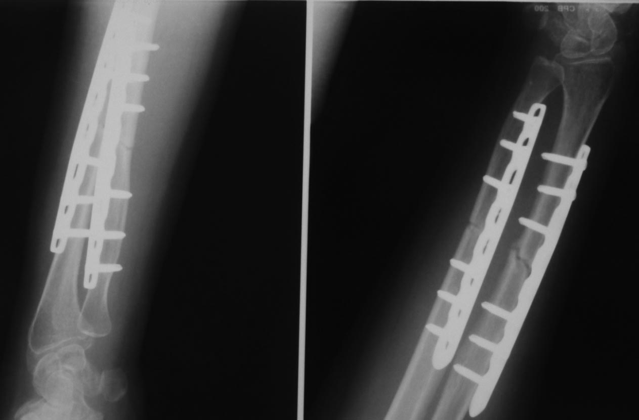Диагностирован перелом головки локтевой кости. На мой взгляд, имеется и перелом по ходу дистального винта лучевой кости (появилось разрежение вокруг винта, которого не было на рентгенограммах через 1.5 мес. после операции). Хотя, локальной болезненности в этом месте нет. Болит в проекции кистевого сустава.