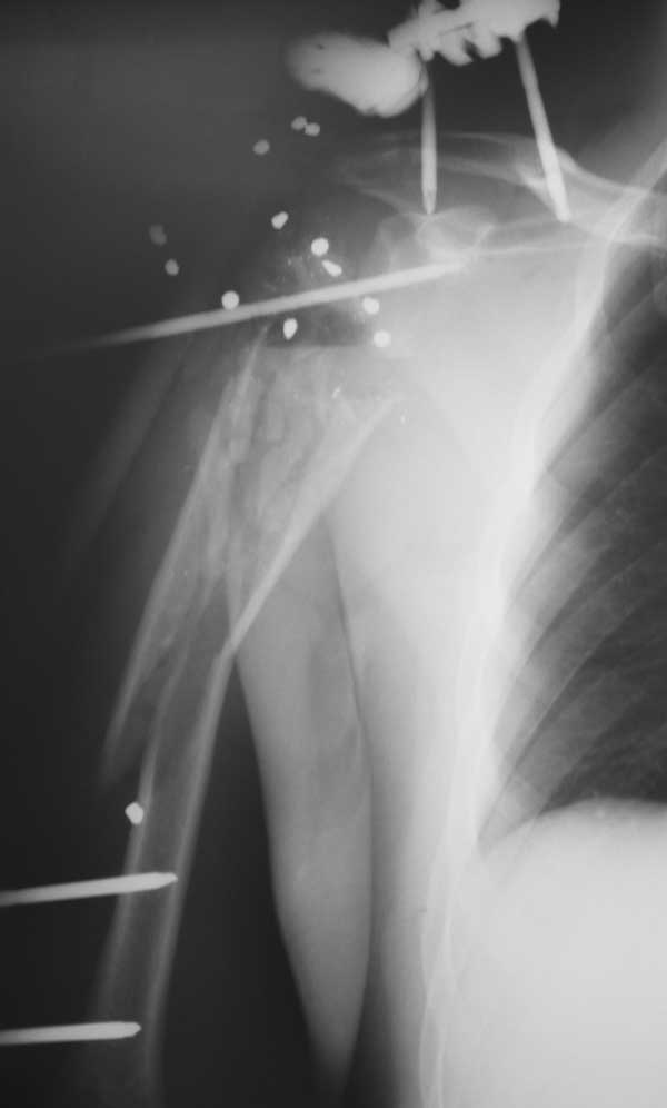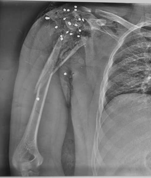 Ничего больше не делать. У меня лет 7 назад был такой точно больной - водитель такси, выстрел из обреза в упор ( c переднего пассажирского сиденья) в плечо. из недочищенной костной крошки вырос неплохой регенерат, движений в плеч суставе, конечно, нет, за счет тораколопаточной артикуляции градусов 30 отведения и сгибания, боли нет