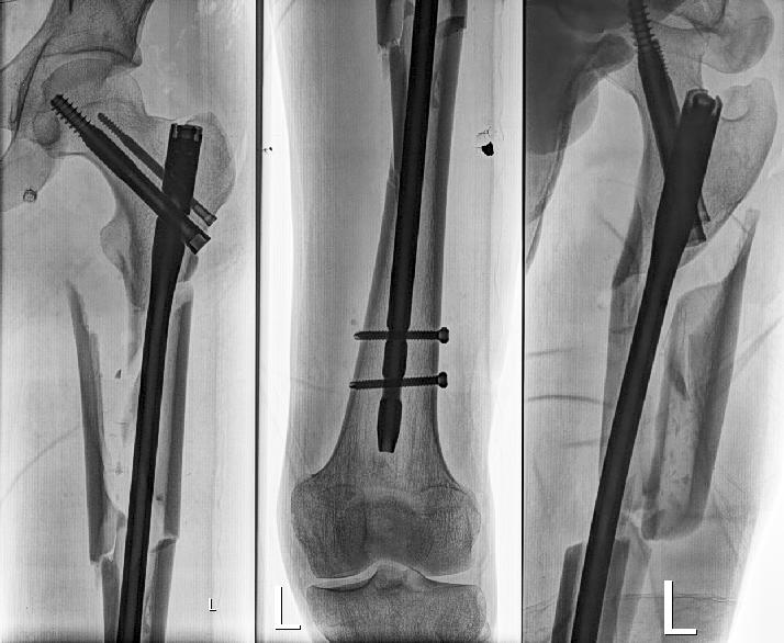 Если пациент молодой - то нет необходимости использовать проксимальные бедренные гвозди для остеопроозных переломов (с диаметром прокимальной части 15-17 мм и шеечными винтами 10-12 мм). Вполне сгодится более изящный реконструкционый гвоздь с проксимальным диаметром 13 мм и винтами 6,5 мм.