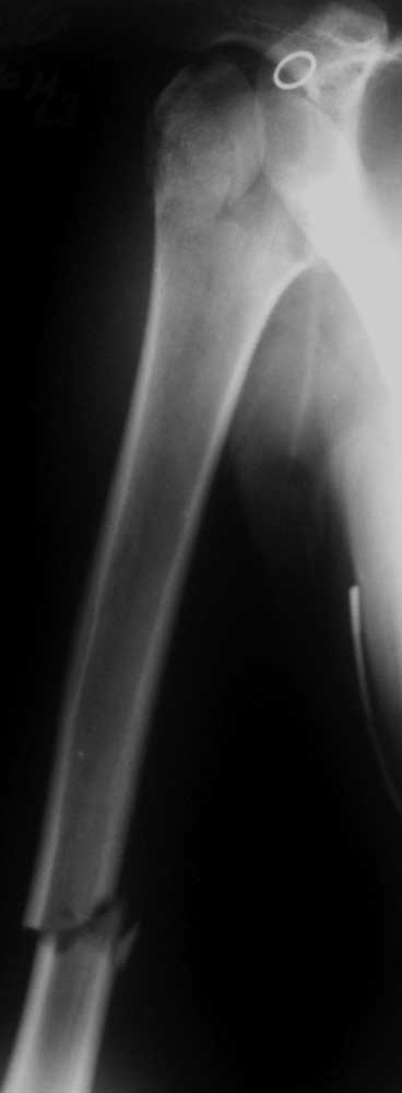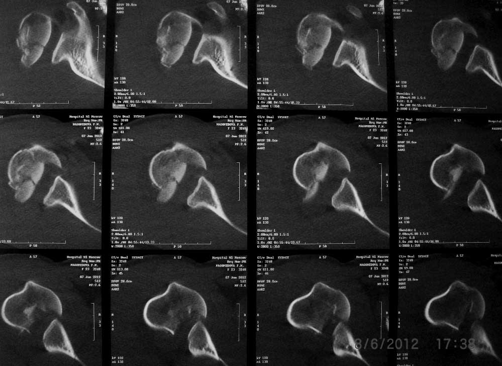 Такое впечатление, что у больной вывих плеча, с перелом большого бугра и переломом Хилл- Сакса. Вправить бы.. под наркозом, а потом решать (может мне показалось?)