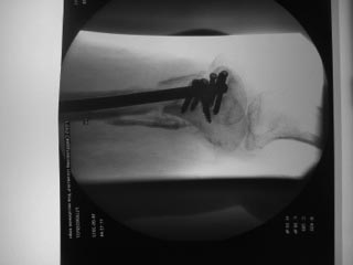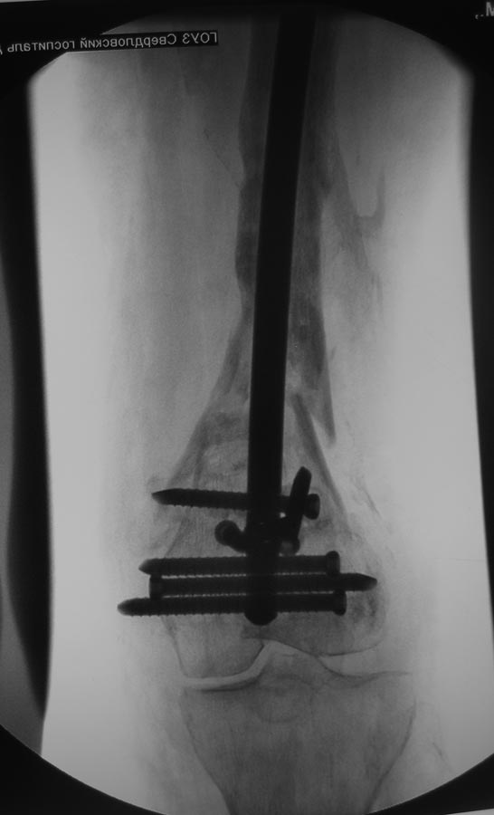 Про переднее положение гвоздя- это есть, но он точно в дистальном отломке, Сместить кзади не получилось из-за множественных дефектов от пластины, пороза, отклоняющие спицы просто режутся