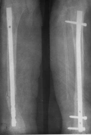 Девочка 2005г.р. В середине 2008 г падает с велосипеда с дедом, возможно был перелом н/з костей левой голени, лечение у знахаря-табиба, но ребенок не смог бегать, часто падал, начал хромать. Май 2009г. обратились к нам, установлен д-з « вялоконсолидирующаяся перелом н/з б/берцовой кости, несросшийся перелом м/берцовой кости со смещением по ширине». Мы решили гипсовая повязка и ходьба с нагрузкой, но по категорическому требованию родителей исправить деформацию м/берцовой кости, произвели операцию ( на свою голову )»о/ репозиция и и/м фиксация спицами м/берцовой кости». Теперь началась самая интересная история! Ч-з недели две в обл. п/о раны м/берцовой открылась свищ с кровянистым выделением, гноя не было, на р-грамме лизис концов отломков м/берцовой кости, к-рый начал прогрессировать, консультирована онкологами, цитология, с подозрением направлена в центральные институты, сделана КТ, онкологическое исключили, в августе попали в остеомиелитический центр, где произведена резекция м/б на протяжение 6-7см, все зажило и выписали (снимок-1). 2010г в мае повторно получила травму, наложена гипсовая повязка (снимок-2) и через 1-2 месяца в одном из центральном институте произведена КДО аппаратом Илизарова , который снят ч-з три месяца (снимок-3) и долго ходила на костылях-мать заставила, как начала наступать, появилась деформация, заказали ортез и так ходила, но деформация прогрессировала, Обратилась к нам в апреле 2012г,(снимок-4) произведена постепенная коррекция на аппарате, и замена на БИОС 01.03.12г плечевым гвоздем, ЭОП нет, поэтому осталась несколько антекурвация (снимок-5), ребенок ч-з неделю начала ходить.Повторный осмотр 22.06.12г- деформация усиливается, за три месяца сращение очень слабое.(снимок-6). (Жаль что многие р-снимки не сохранились, мать обещала хотя бы часть найти)!