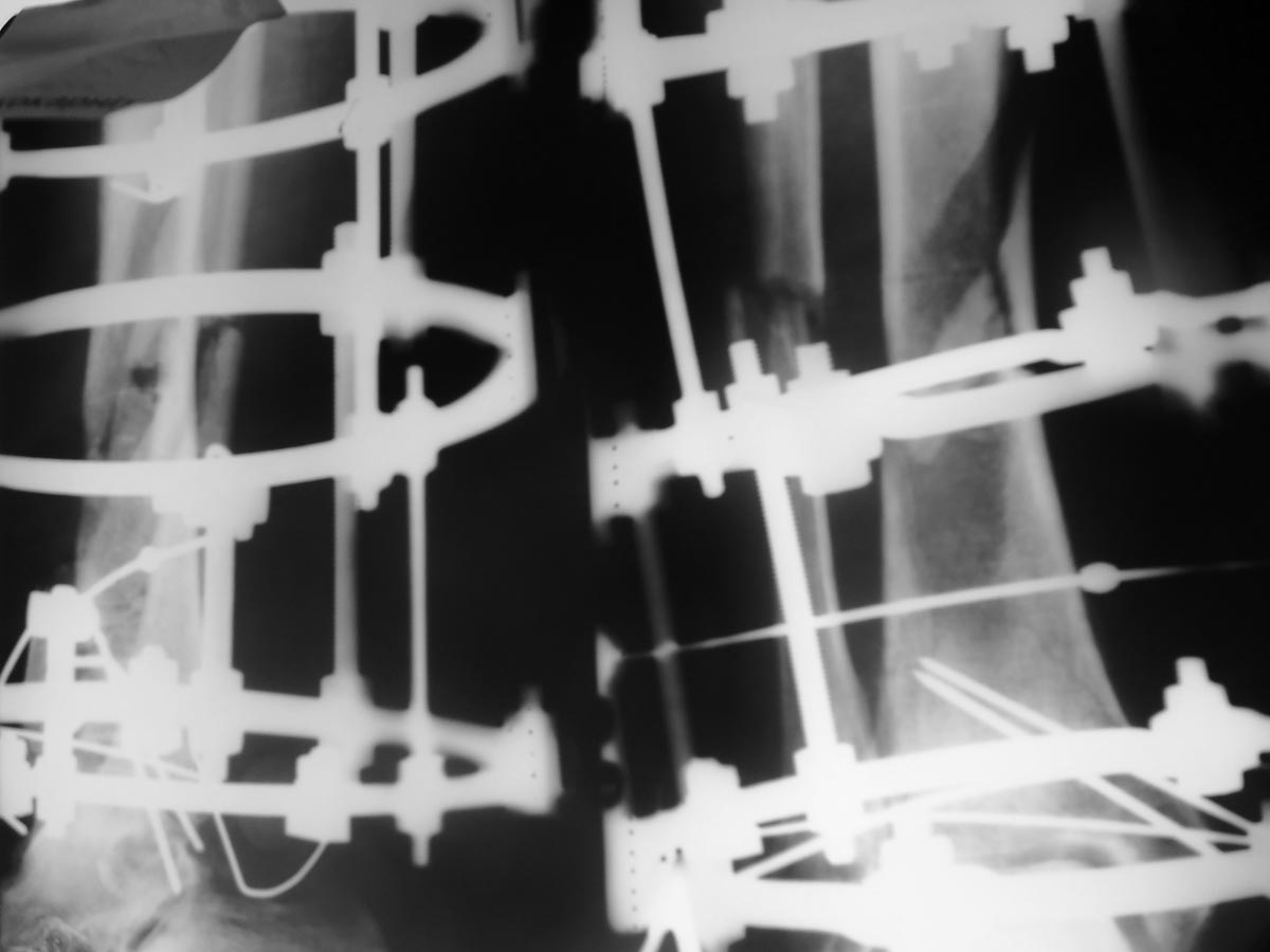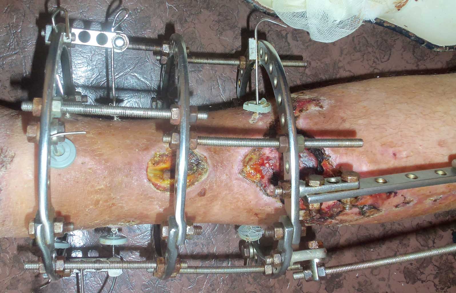 Уважаемый, Дмитрий. ЧКО с помощью аппарата Илизарова это не только фиксация, но и еще компрессия и дистракция, а еще возможность управления положением отломков. Как видно из компоновки аппарата (спицефиксаторы старого образца, спицы скушены близко к опорам, спицы не изогнуты) возможно вы не использовали все возможности аппарата Илизарова, а возпользовались только фиксацией (видимо и не наступила консолидация). Возможно следует сделать: перемонтаж апарата Илизарова для облегчения доступа к ранам, устранения скольжения голени по спицам, аутодермоплатиска ран. А далее Rg снимки в форум.