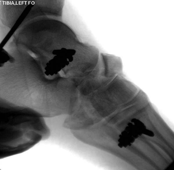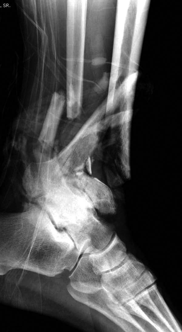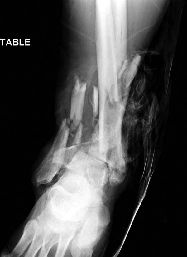 Через три дня повторная I&D, где через рану манипулировали дистальным фрагментом с установкой пары межфрагментарных шурупов. На рану вакуум и следующая обработка закончилась закрытием раны. Отек держался немного дольше, чем обычно.