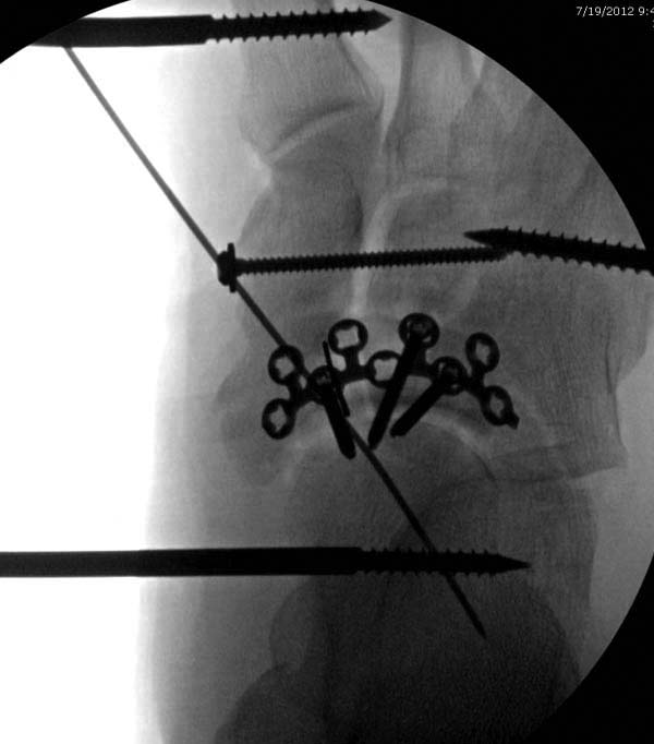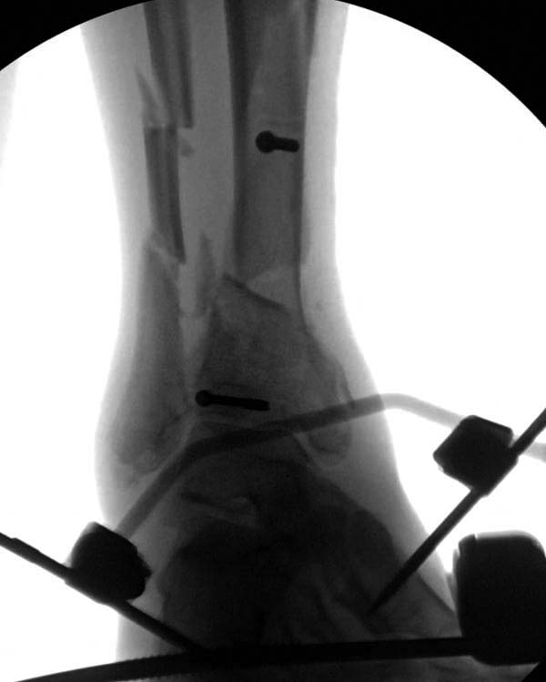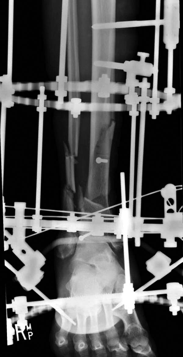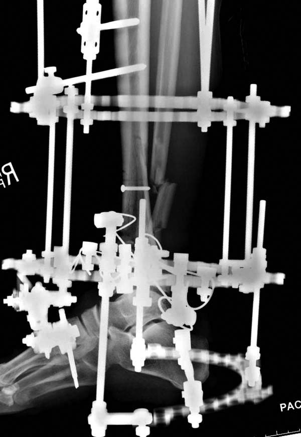 После спадения отека вариантов фиксации много, включая мининвазивную технику, но данный случай закончили установкой простого аппарата Илизарова.