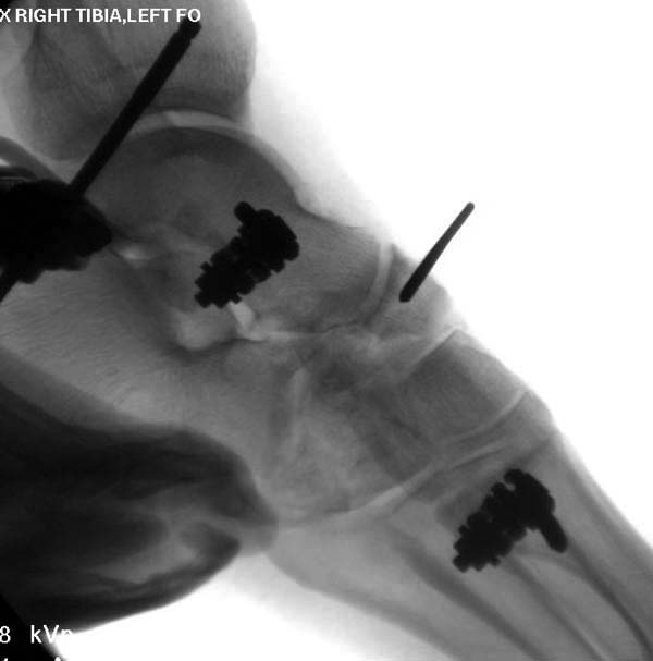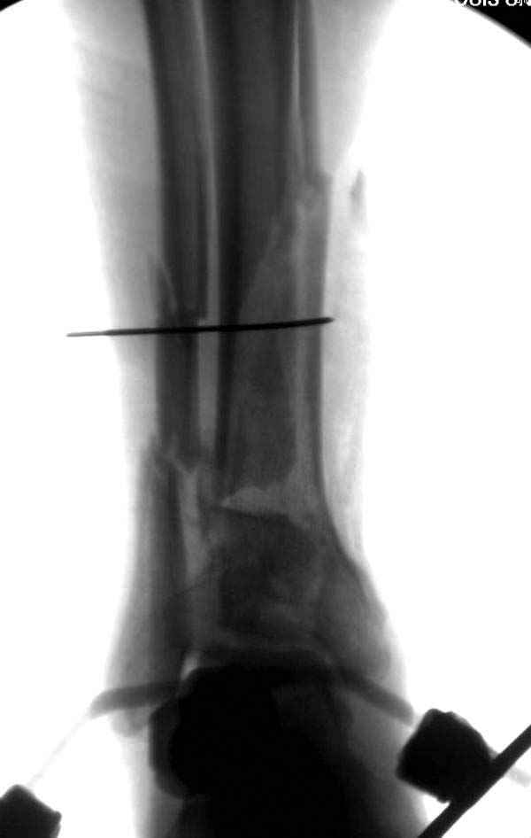 Второй случай. Не уверен в целесообразности и приемлемости выбранного подхода, но внешние обстоятельства требовали от больной передвижения и полной нагрузки на ногу сразу после операции. Размер костных фрагментов не позволял разместить блокирующие винты в дистальном эпифизе. Была выполнена открытая репозиция перелома из передне-медиального доступа, остеосинтез спицами, интрамедуллярный блокированный остеосинтез с созданием временного артродеза голеностопного сустава. Разрешена полная нагрузка на ногу сразу после операции. Через 3,5 месяца стержень удалён.