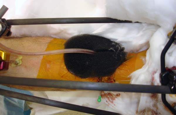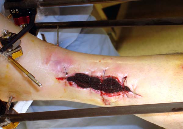 Через три дня повторная I&D, где через рану манипулировали дистальным фрагментом с установкой пары межфрагментарных шурупов. На рану вакуум и следующая обработка закончилась закрытием раны. Отек держался немного дольше, чем обычно.
