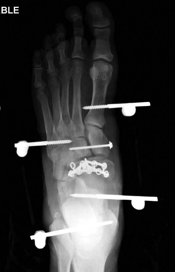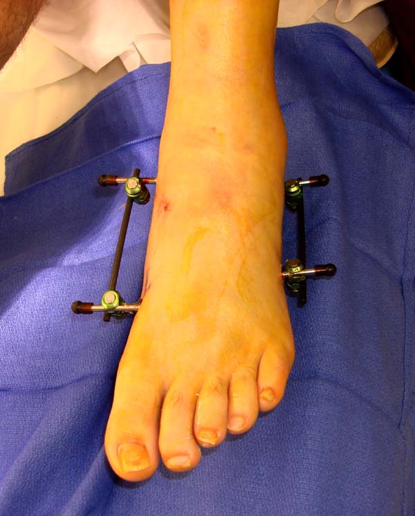 Через три дня оперирована стопа и для нейтрализации сил колонн оставили наружный фиксатор.