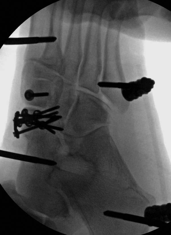 В первом случае после дистракции и КТ было установлено, что дистальный эпифиз состоит из трёх крупных фрагментов, в которых полиаксиально могут быть размещены три блокирующих винта. После открытой реконструкции суставной поверхности, выполненной через трансфибулярный доступ и фиксации отломков, содержащих суставную поверхность спицами, выполнен интрамедуллярный блокированный остеосинтез. Лечение без внешней иммобилизации. Полная нагрузка на ногу – через три месяца.