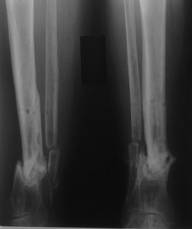 Больной А 50 лет. Тугой ложный сустав н/3 костей голени, был открытый оскольчатый перелом н/3 костей голени в 2010 году, лечение консервативное, 2011 году по поводу ложного сустава оперирован в г. Ташкенте: ВКДО аппаратом Илизарова, в свизи с болевым синдромом и инфицированием вокруг спиц, больной отказался от аппаратной фиксации, (психологический пациент не совсем адекватный), ч/3 6 мес демонтаж аппарата, но рентгенологических признаков консолидации нет. В данный момент голень фиксирована эластическим бинтом, наступает с помощью троста, хромает, у больного сопутствующий посттравматическая болезнь головного мозга, парез правой в/к. В н/к пареза нет.Какая тактика лучше: 1.У меня на руках есть: Интрамед ретроградный стержень для большеберцовой кости (Chm)- 8-10х240-260мм. и Аппарат Илизарова. 2. Как репонировать костныt отломкb (открытым или закрытым способом), 3. Резекция краев костных отломков (адаптировать) и очистка от рубцовых тканях надо или нет. 4. Аутопластика спонгиозной костью... 5. Оптимальный метод остеосинтеза 6. В проксимальных отделах стержня нет овального отверстия для динамизации, при этой ситуации динамизация...