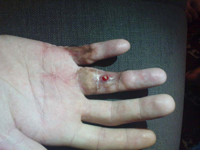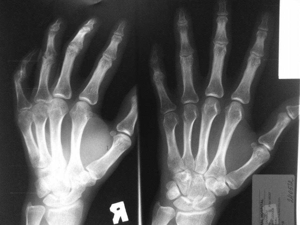 из Уважаемые Коллеги! Помогите разобраться с диагнозом, из анамнеза молодой человек 27 лет, порезал руку ножом в области 4 и 5 пальцев правой кисти, Далее он обращаеется в другое травм отделение где просит врача выпрямить ему эти пальцы, что врач и сделал (артродез межфаланговых суставов в нефункциональном положении, а полностью разогнутом, прямом). После этого начинается самое интересное - уже ровно год после этих событий непрекращающее гноетечение из свищей 4 пальца на уровне проксимальной-средней фаланги. Ему 4 раза в поликлинике и в одном из хирургических стационаров лечили консервативно и оперировали безуспешно от костного панариция. Когда обратился ко мне на уровне средней фаланги 4 пальца, свищ по ладонной поверхности, типично как при костном панариции (остеомилите фаланги), но когда я посмотрел на снимок костей, то не увидел остеомиелита, небольшой остеопороз, но он не может быть начальным проявлением остеомилита фаланги, так как является временным переходным состоянием секвестрации фаланги и длится не более 2 недель при отсутсвии лечения, а с момента артродеза прошел уже год. Наводит на мысль про хронический гнойный тендовагинит, но разве так долго может длиться процесс суставного панариция, да и неужели только я не вижу остеомилита? Прилагаю фото и рентгенограмму больного. Если тендовагинит, тогда буду проводить или проточно-промывное дренирование или же ваккумное дренирование после ревизии пальца, сам больной так устал, что просил ампутировать палец.