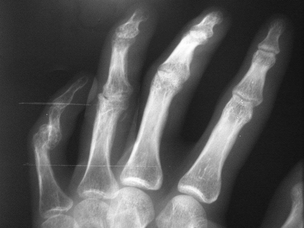 Уважаемые Коллеги! Помогите разобраться с диагнозом, из анамнеза молодой человек 27 лет, порезал руку ножом в области 4 и 5 пальцев правой кисти, в виду особого состояния (запой), только через 2 месяца обратился в одно из травмотделений с резаной раной 4,5 пальцев правой кисти и полным разрывом сухожилий сгибателей, где был произведен неудачно поздний вторичный шов сухожилий сгибателей, после операции стойкая сгибательная контрактура этих пальцев. Далее он обращаеется в другое травм отделение где просит врача выпрямить ему эти пальцы, что врач и сделал (артродез межфаланговых суставов в нефункциональном положении, а полностью разогнутом, прямом). После этого начинается самое интересное - уже ровно год после этих событий непрекращающее гноетечение из свищей 4 пальца на уровне проксимальной-средней фаланги. Ему 4 раза в поликлинике и в одном из хирургических стационаров лечили консервативно и оперировали безуспешно от костного панариция. Когда обратился ко мне на уровне средней фаланги 4 пальца, свищ по ладонной поверхности, типично как при костном панариции (остеомилите фаланги), но когда я посмотрел на снимок костей, то не увидел остеомиелита, небольшой остеопороз, но он не может быть начальным проявлением остеомилита фаланги, так как является временным переходным состоянием секвестрации фаланги и длится не более 2 недель при отсутсвии лечения, а с момента артродеза прошел уже год. Наводит на мысль про хронический гнойный тендовагинит, но разве так долго может длиться процесс суставного панариция, да и неужели только я не вижу остеомилита? Прилагаю фото и рентгенограмму больного. Если тендовагинит, тогда буду проводить или проточно-промывное дренирование или же ваккумное дренирование после ревизии пальца, сам больной так устал, что просил ампутировать палец.