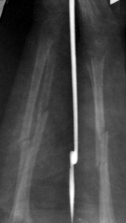 из Пациентка 49 лет, по поводу перелома обеих костей предплечья оперирована в марте месяце « и/м остеосинтез спицами»,