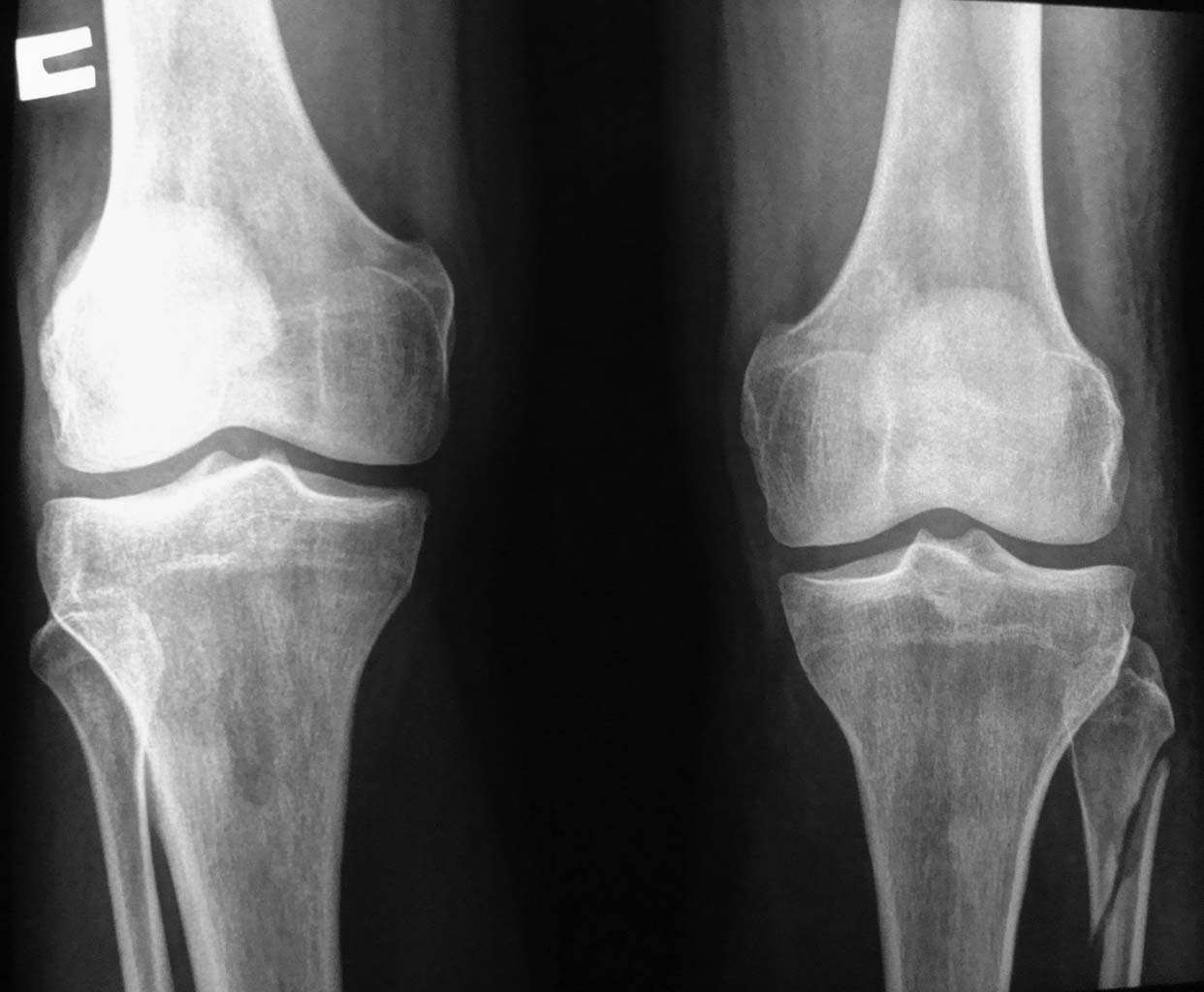 В диагностике опухоли локализация и возраст пациента являеются важными. Из всех патологий большеберцевой фиброзная дисплазия более близка к представленной картине, но в третьей декаде жизни встречается очень редко. Остеофиброзную дисплазию многие онкологи считают проявлением регрессивной фазы адамантиномы, которая, в отличие от фиброзной дисплазии, является злокачественной формой опухоли большеберцовой кости.