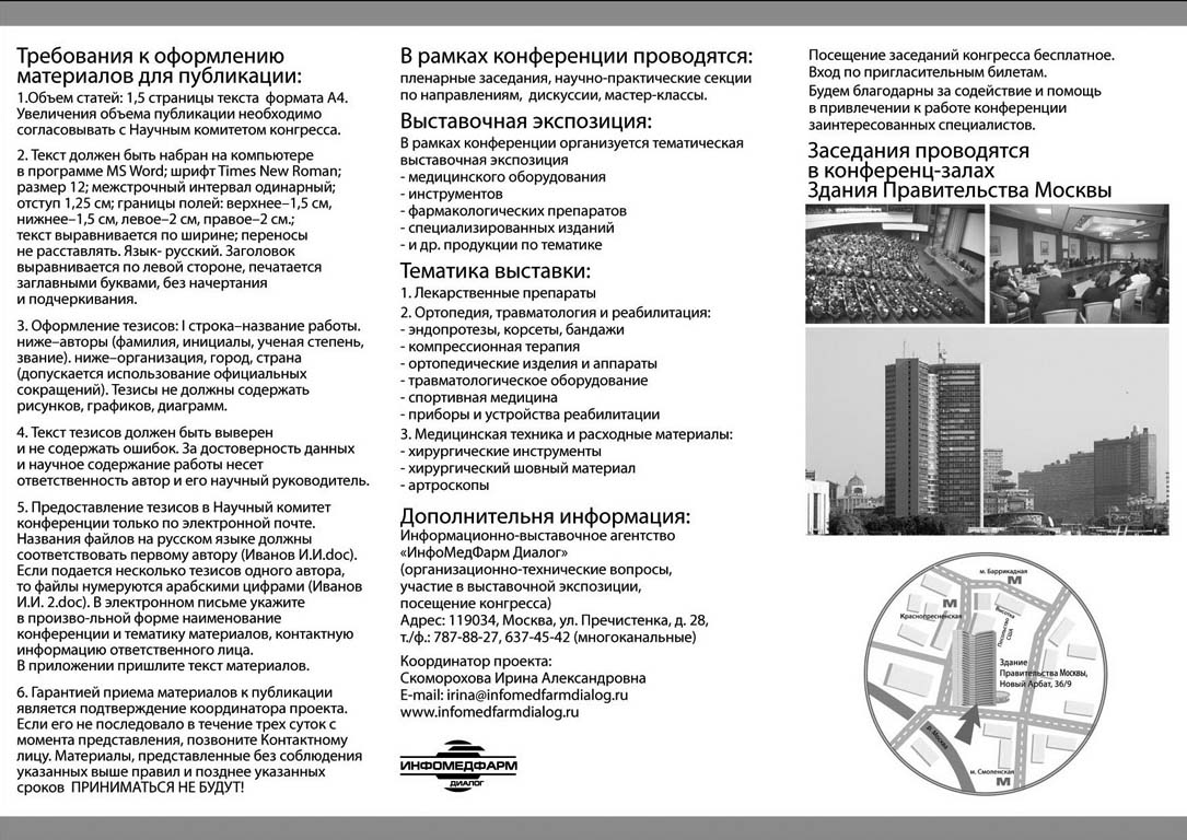 Уважаемые коллеги! Приглашаем Вас принять участие в работе Первой научно-практической конференции «Актуальные вопросы ортопедии. Достижения. Перспективы.» Организаторы: Департамент здравоохранения города Москвы Кафедра травматологии и ортопедии РУДН Ассоциация травматологов-ортопедов г. Москвы Информационно-выставочное агентство «ИнфоМедФарм Диалог» В рамках конференции планируется выступление зарубежных лекторов. Основные научно-практические направления программы конференции: Эндопротезирование суставов: доступы, выбор пары трения, первичное и ревизионное эндопротезирование, виды фиксации, костные цементы, костная пластика, трабекулярный металл, система навигации – нужна ли она, аллергия и эндопротезирование, протезировать ли надколенник, осложнения и их лечение и профилактика; инфекция – угроза эндопротезирования- что можно ей противопоставить; фиксированная и подвижная платформа в эндопротезировании коленного сустава – за и против; как часто использовать эндопротезы коленного сустава с задним стабилизатором; эндопротезирование голеностопного сустава или артродез сустава – показания и результаты; эндопротезирование суставов у детей и подростков, эндопротезирование при дисплазии, РА, ББ, переломах вертлужной впадины, что нового имеется для ревизионных операций Место остеотомий костей в лечении ортопедических заболеваний: утраченные позиции или дань модным веяниям в ортопедической хирургии. Хирургия стопы: оперативное лечение передних отделов стопы, лечение плоскостопия, нужны ли лавсановые связки, миниинвазивные вмешательства на стопе, амбулаторные операции на стопе, операции на мягкотканом аппарате стоп, эндопротезирование мелких суставов стоп- есть ли перспективы, хирургия среднего и заднего отделов стопы, роль сухожильного аппарата голени в развитии деформаций стопы. Хирургия кисти: наиболее частые ортопедические операции на кисти, ревматоидная кисть, эндопротезирование суставов, роль артродезов мелких суставов кисти в самообслуживании, врожденные деформации и их коррекция Детская ортопедия: хирургическая и консервативная помощь детям с ортопедической патологией, роль реабилитации, детские ортезы, протезы и эндопротезы, сколиозы у детей- какие эндокорректоры выбирать, место галлааппарата в хирургии позвоночника Хирургия позвоночника: дегенеративные заболевания позвоночника и их лечение, стенозы, листезы, доступы , грыжи дисков – минихирургия в их лечении, эндопротезирование дисков – или спондилодез, тяжелые спондилолистезы и сподилоптозы – их лечение, метастазы позвонков – их диагностика и способы леченияОстеопороз: состояние вопроса, что мы имеем сегодня, чем мы лечим остеопороз, эндопротезирование суставов и остеопороз, Костная патология: первичные и метатстатическое поражения костей и суставов, порядок оказания ортопедической помощи онкологическим больным, радио – и химиотерапия и остеоинтеграция, онкологические эндопротезы, профилактика инфекции Артроскопия суставов: клеточные технологии в лечении хрящевых повреждений, место хондропротекторов в лечении дегенеративных заболеваний суставов, что происходит с надколенником после забора аутотрансплантатов для пластики ПКС, синтетические связки, артроскопия тазобедренного сустава и импинджмент синдром, нестаби