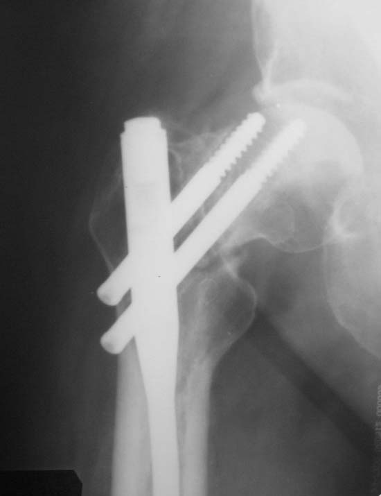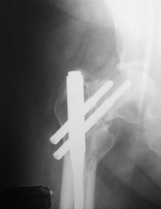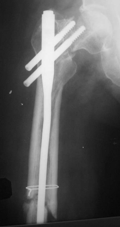 Пациент (мужчина), 34 года. Травма в результате ДТП в апреле 2011 года. Проводилось оперативное лечение – закрытая репозиция, остеосинтез AFN. В октябре 2011 года – декортикация, тунелизация, фиксация отломков верхней трети диафиза бедренной кости проволочным серкляжом, удаление дистального блокирующего винта. На контрольных рентгенограммах определяется миграция шеечных винтов конструкции. Пациент передвигается на костылях с дозированной нагрузкой на ногу (полная нагрузка болезненна в области тазобедренного сустава). Вариант лечения - тотальное эндопротезирование тазобедренного сустава+остеосинтез верхней трети диафиза бедренной кости (ретроградным стержнем ЦИТО, пластиной, АНФ).Жду Ваших комментариев