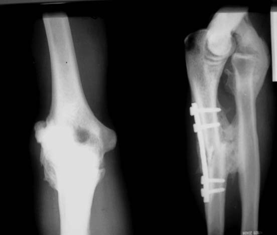 В плане лечения неправильно сросшийся перелом не даст репонировать головку. Значит надо делать остеотомию локтевой кости с хорошей чисткой мозоли. Доступ - задне-латеральный по Boyd-у, но не представляю как удастся очистить головку от мозоли и репонировать. А фиксировать по-новому локтевую кость только с репонированной головкой. Может тогда и достигнется какое-то движение в суставе.