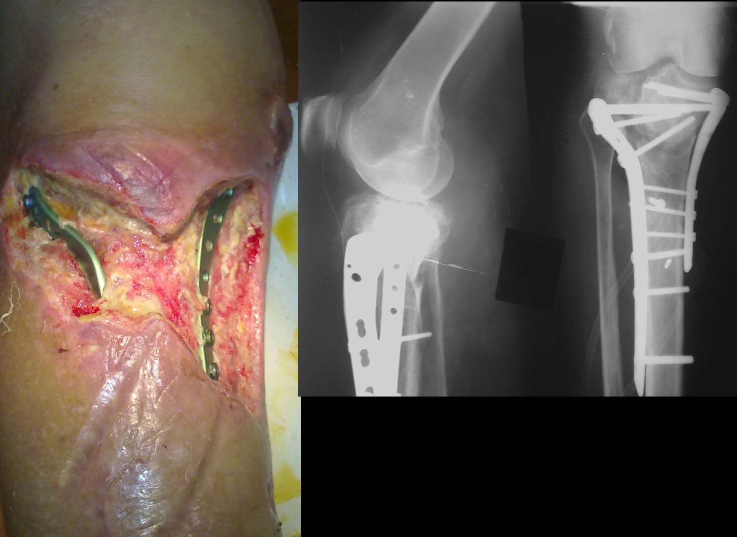 Первоочередная задача в Вашем случае санация раны и восстановление мягких тканей в зоне перелома. После хирургической обработки раны можно выполнить закрытие лоскутами из медиальной и латеральной головой икроножной мышцы. Из местных мышечных лоскутов на голени- это наиболее надежные и простые лоскуты. Аутодермопластику поверхности лоскутов лучше выполнить сразу, одномоментно. Технический момент: иссекайте плотный апоневроз по передней поверхности лоскутов, чтобы зона перелома контактировала с хоошоваскуляризированной мышечной тканью, а не с плотным, практически бессосудистым апоневрозом. По поводу удаления фиксатора: несмотря на многочисленные сообщения в литературе, что при условии закрытия дефекта мягких тканей фиксатор можно оставить, я не помню случая, когда нам это удалось. Почти все случаи кончались глубоким нагноением в зоне перелома. Наверное, в Вашем случае мы, совместно с травматологами, поступили бы следующим образом: хирургическая обработка раны, удаление пластины, мостовидная фиксация стержневым аппаратом наружной фиксации (3 стержня в дистальный отломок большеберцовой кости, 3 стержня в бедренную кость, пластика дефекта мягких тканей лоскутами из латеральной и медиальной головок икроножной мышцы, аутодермопластика поверхности лоскутов. Далее через несколько недель, если все получиться и рана не нагноиться можно перейти на фиксацию в аппарате Илизарова.