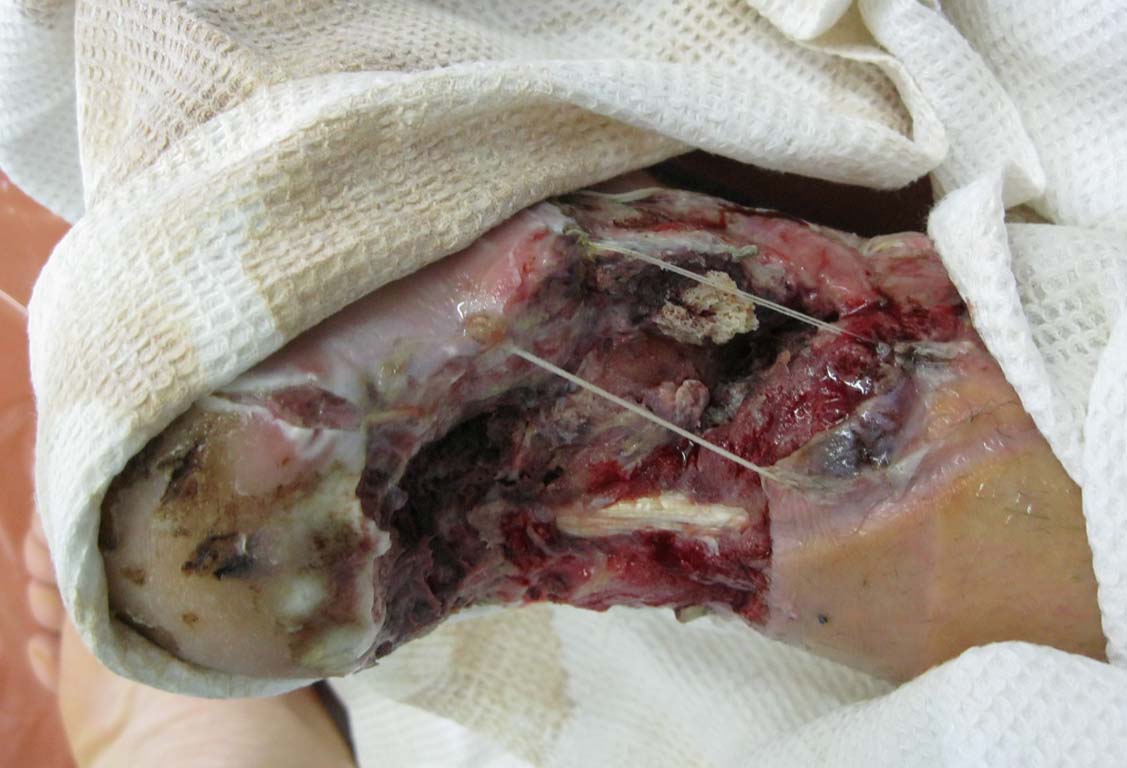 2. кровоснабжение стопы не страдает, артерии не повреждены, нарушений чувствительности нет. Пациент адекватен. Об ампутации думали, но пока рука не поднимается.